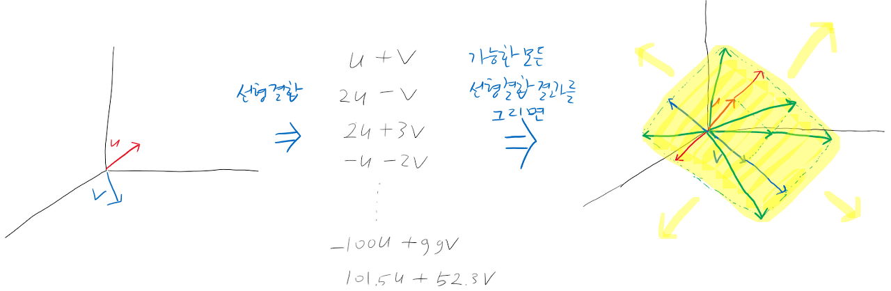 그 벡터들을 선형 결합하면, 3차원 공간 내 어떤 점이라도 미칠 수 있다는 의미입니다.
