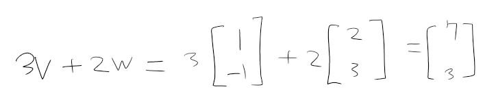 벡터 v에 3을 곱한 것과 벡터 w에 2를 곱한 것을 더해주면 다음과 같이 됩니다.