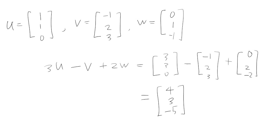 3차원 벡터들을 선형조합한 하나의 예는 다음과 같습니다.