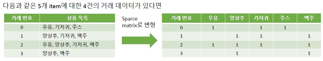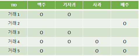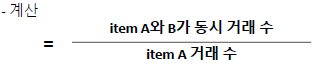 - 맥주-배추 같이 구입한 횟수는 2회 / 맥주 거래 수 4회 = 맥주-배추 신뢰도는 2/4 = 0.5