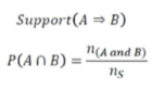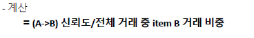 - 정의 : 전체 거래(N) 중 item A와 B를 동시에 포함하는 거래 비율. S(A->B)