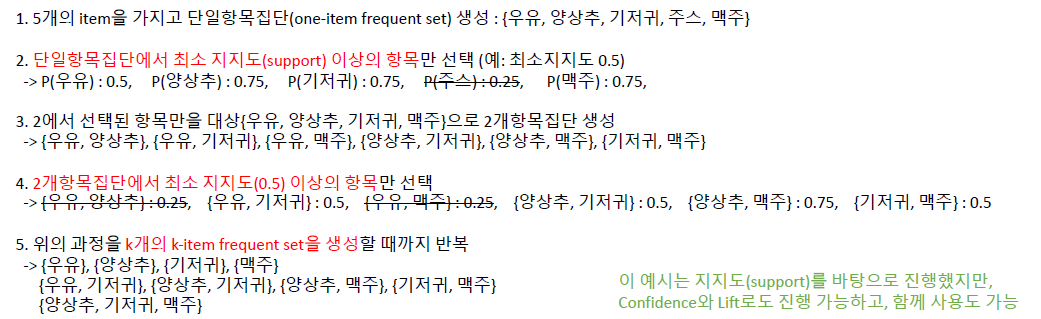 5. 위의 과정을 k개의 k-item frequent set을 생성할 때까지 반복