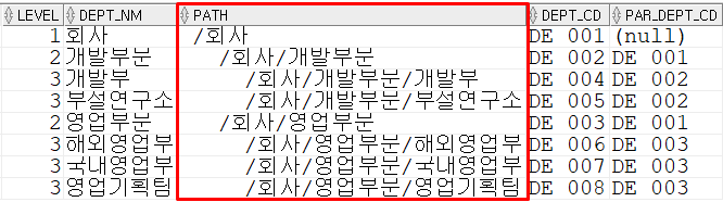 LPAD(' ', 2*LEVEL-1) || SYS_CONNECT_BY_PATH(DEPT_NM, '/') PATH,