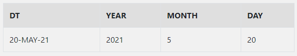 , EXTRACT( DAY FROM TO_DATE( '2021-MAY-20 15:30:20 ', 'YYYY-MM-DD HH24:MI:SS' ) ) AS DAY
