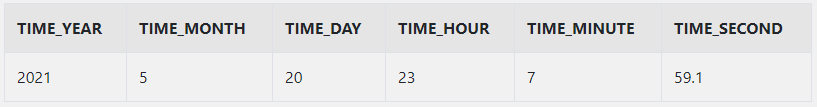 | TIMESTAMP | YEAR, MONTH, DAY, HOUR, MINUTE, SECOND |