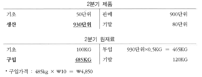 ㈜한국공항은 단일제품을 생산, 판매하고 있다. 제품 1단위를 생산하기 위해서는 직접재료 0.5kg이 필요하고, 직접재료의 kg당 구입가격은 ₩10이다. 1분기 말과 2분기 말의 재고자산은 다음과 같이 예상된다.