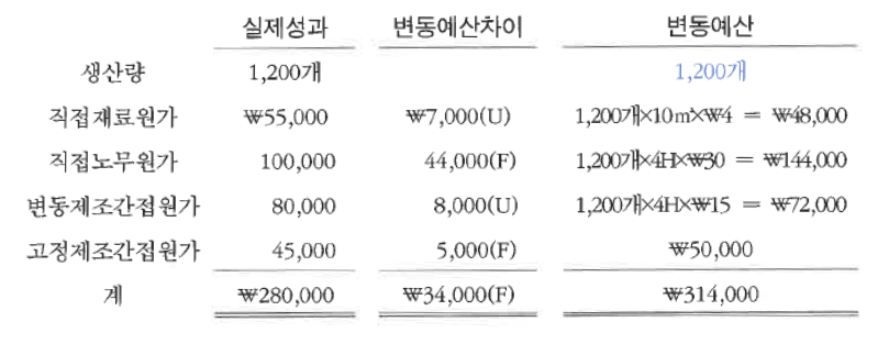 실제 생산량인 1,200개를 기준으로 한 변동예산과 비교해서 실제원가 총액이 ₩34,000만큼 감소하였으므로 ㈜한국공항은 당기 제조활동을 효율적으로 수행했다고 평가 할 수 있다. 다만 차이분석은 여기서 그치지 않고 추가적인 분석을 수행해야 한다. 왜냐하면 각 원가요소별로 변동예산차이에 대한 책임이 서로 다른 관리자에게 있기 때문이다.