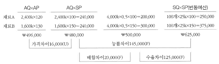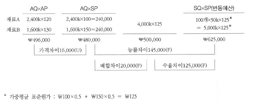 (2) 배합차이(mix variance) : 고급재료를 50% 비율로 투입하는 것이 예산이나 실제 60% 비율로 투입하여 재료원가가 증가