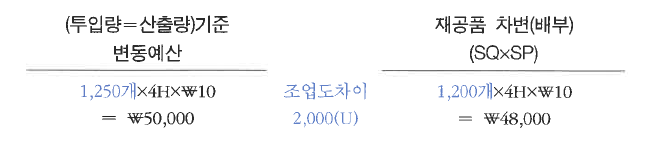 (2) 직접노무원가 능률차이(efficiency variance) : ㈜한국공항은 제품 1,200개 생산을 위해 총 4,800시간의 노무를 해야 하는데 실제로는 5,000시간으로 200시간만큼 노무시간이 증가하였다. 이에 따라 원가가 ₩6,000만큼 증가하였는데 이것이 직접노무원가 능률차이 이다. 직접노무원가 능률차이는 직접노무시간의 차이이므로 시간차이(time variance)라고도 한다.