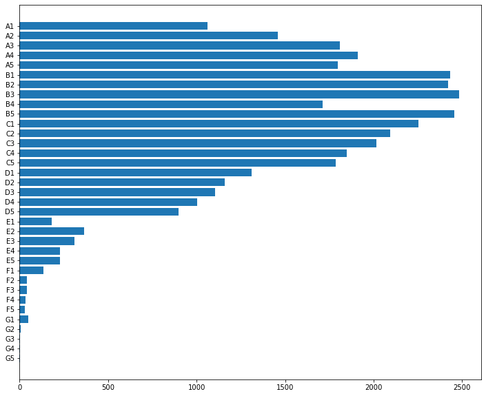 plt.barh(df["sub_grade"].value_counts().sort_index(ascending=False).index, df["sub_grade"].value_counts().sort_index(ascending=False).values)