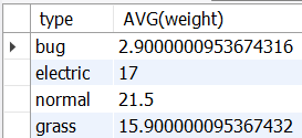SELECT type, COUNT(*), COUNT(1), AVG(height), MAX(weight)