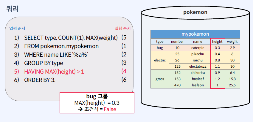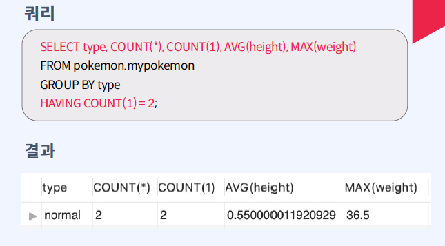 - HAVING 절의 조건식에서는그룹 함수를 활용