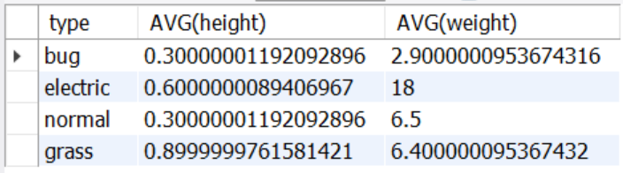 내포켓몬의 타입별 키의 평균과 몸무게의 평균을 함께 가져와주세요.